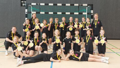 Nach dem Schlusspfiff kannte der Jubel in der Halle keine Grenzen mehr. Tosender Applaus von der Tribüne, strahlende Gesichter bei den Spielerinnen und eine rundum gelungene Meisterehrung machten den Saisonabschluss zu einem besonderen Erlebnis. Die Mädchen wurden mit Medaillen ausgezeichnet, das Trainerteam erhielt kleine Präsente und auch der HSG-Vorstand richtete noch einige Worte an die Mannschaft. Musikalisch begleitet wurde die Ehrung von ausgelassener Stimmung in der Halle, sodass Spielerinnen, Eltern und Fans gemeinsam diesen schönen Moment feiern konnten. Ein solcher Abschluss zeigt einmal mehr, wie viel Freude, Teamgeist und Zusammenhalt im Jugendhandball stecken. Ein großes Dankeschön an alle Beteiligten – an die Spielerinnen für ihren Einsatz, an das Trainerteam für die engagierte Arbeit, an die Eltern für die Unterstützung und natürlich an die vielen Helferinnen und Helfer im Hintergrund, die diese tolle Saison möglich gemacht haben